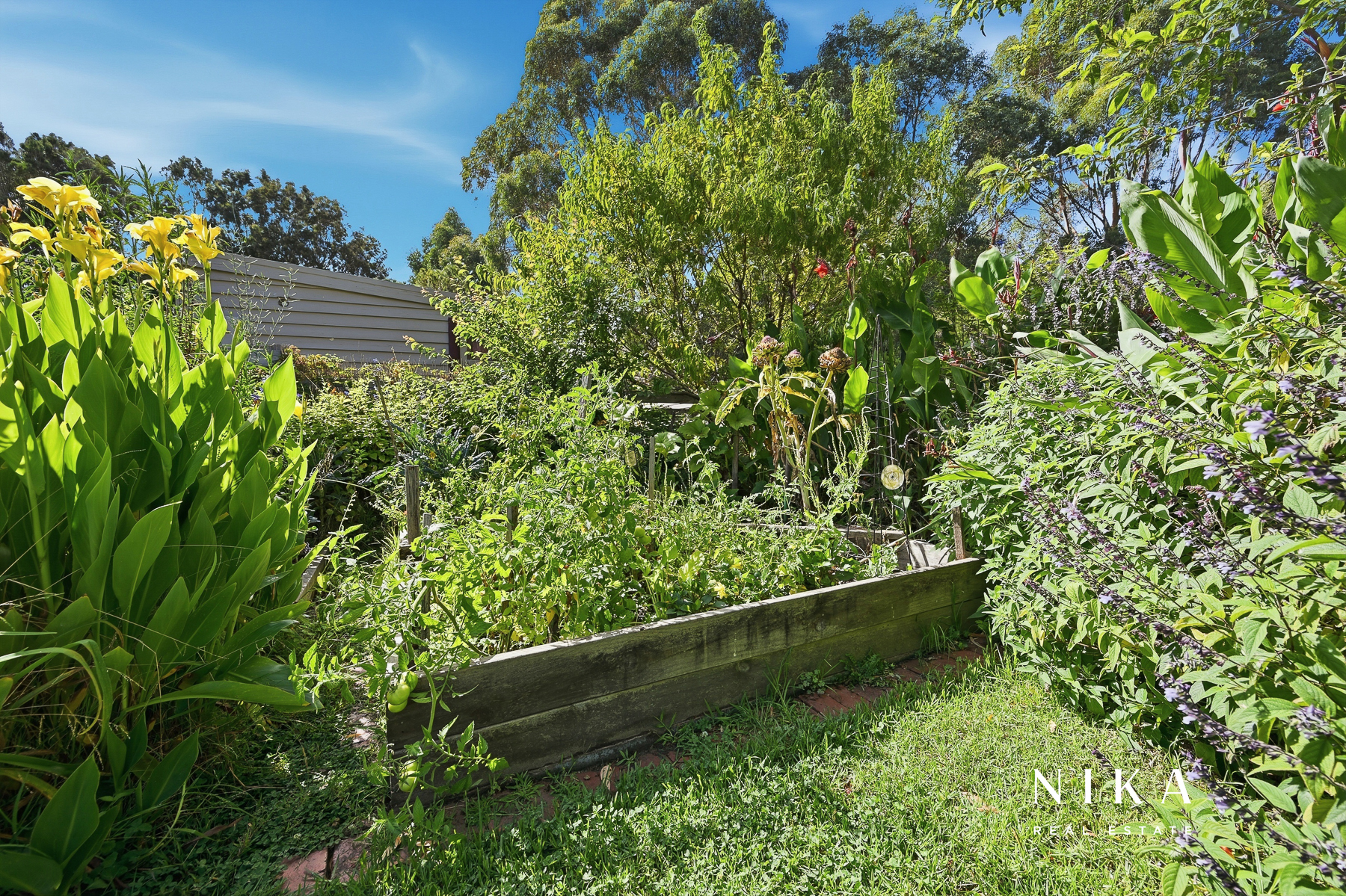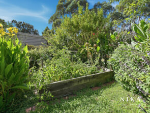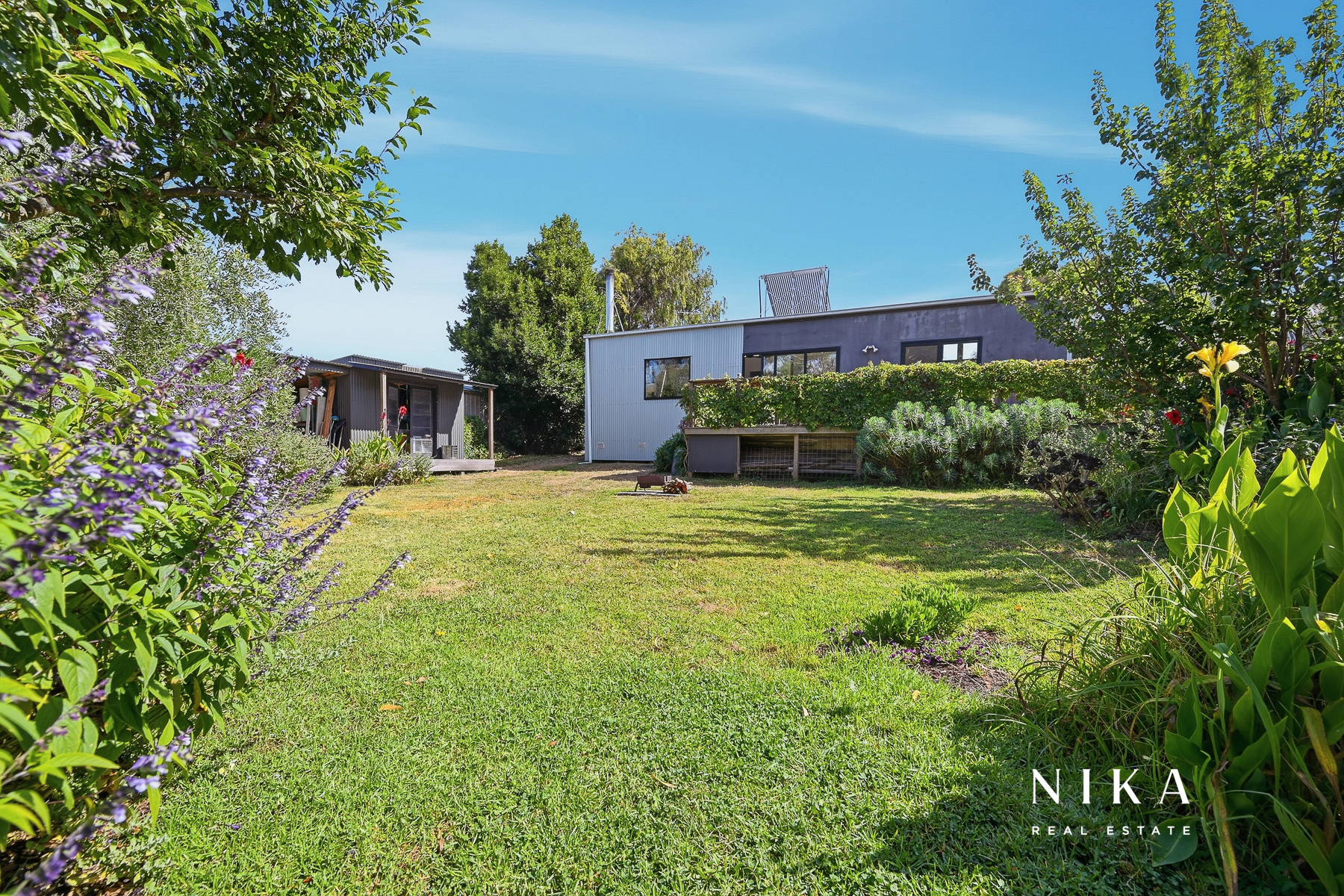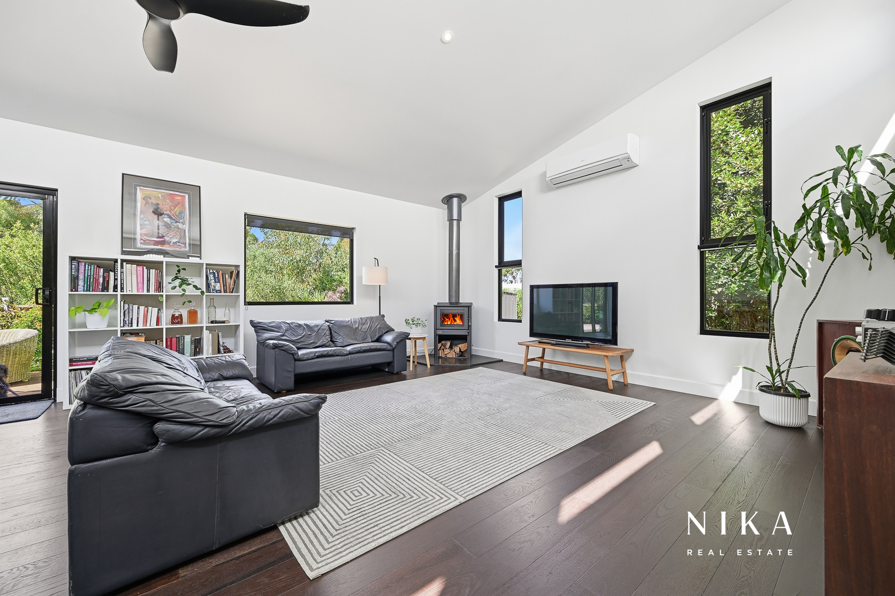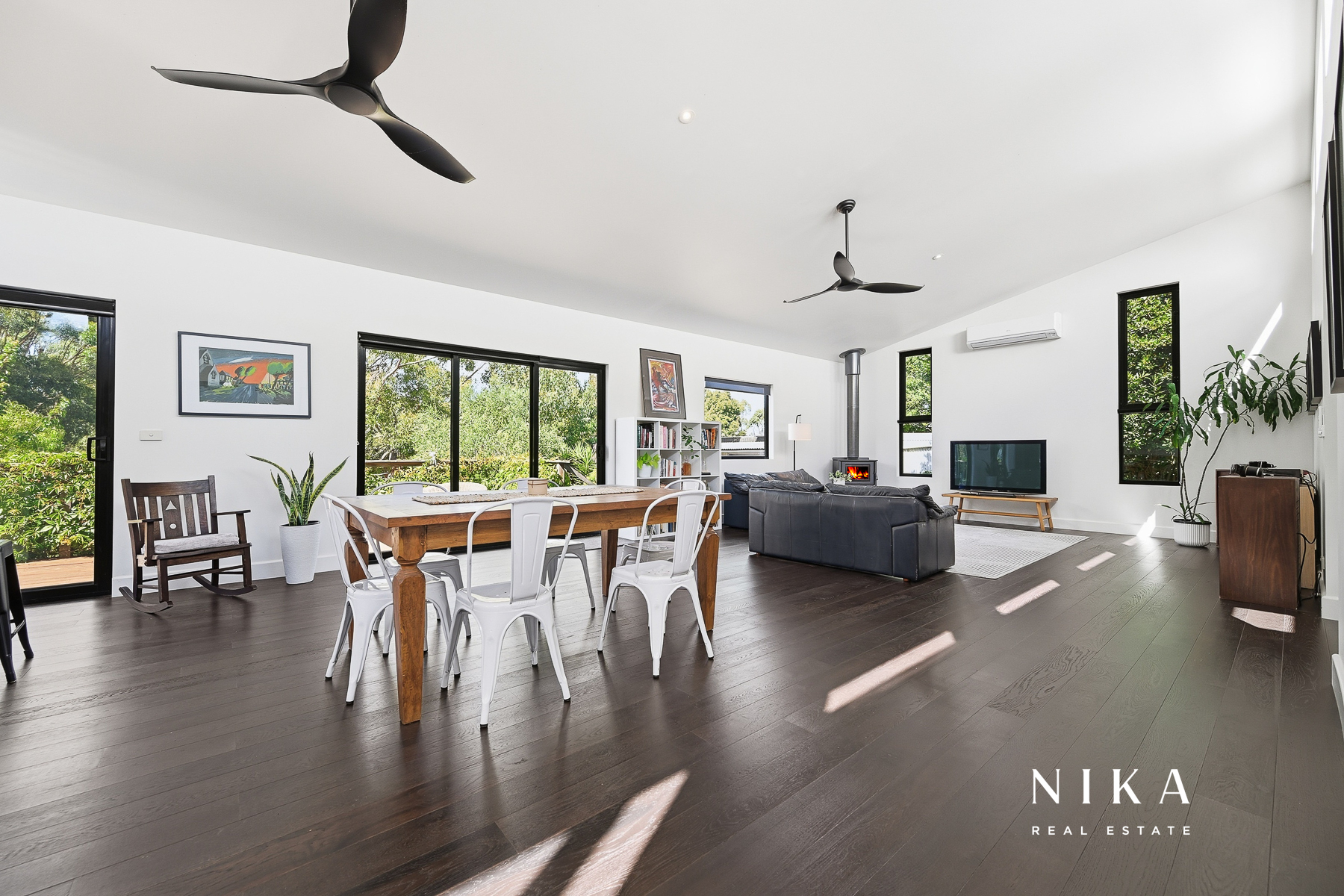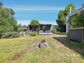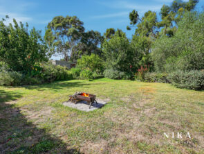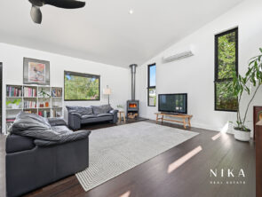 This modern space is perfect for entertaining or relaxing, featuring solid fuel heating to ensure comfort throughout the year. The seamless transition to the rear deck invites you to experience the beauty of outdoor living. Here, you can enjoy serene views of the garden, which boasts an array of fruit trees and well-maintained garden beds, creating a peaceful retreat right at your doorstep.